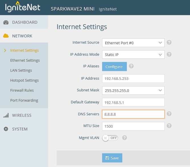 Once into the web interface, go to: Network -> Internet settings to make the changes (don't forget to select 'Static IP' IP address Mode):